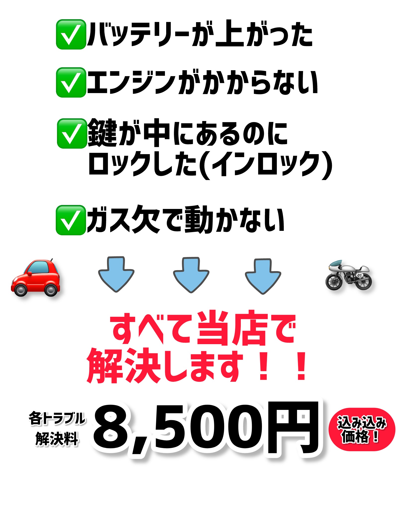 解決せず、エンジンがかからなかった場合は費用をいただきせん。